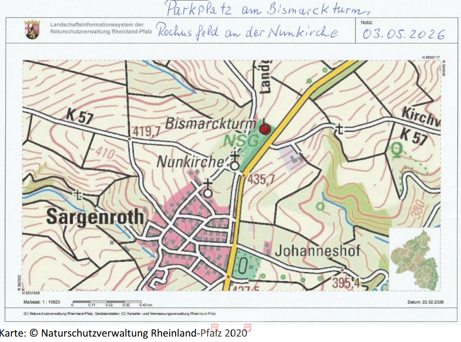 Die Exkursion führt uns zu 2 bedeutenden Orchis morio-Fundstellen im Hunsrück. Wir bewegen uns auf den MTB’s 6011/3 und 5912/3. Treffpunkt 10.00 Uhr: Wir finden uns auf dem Parkplatz am Bismarckturm bei Sargenroth (roter Punkt in der Karte) ein.