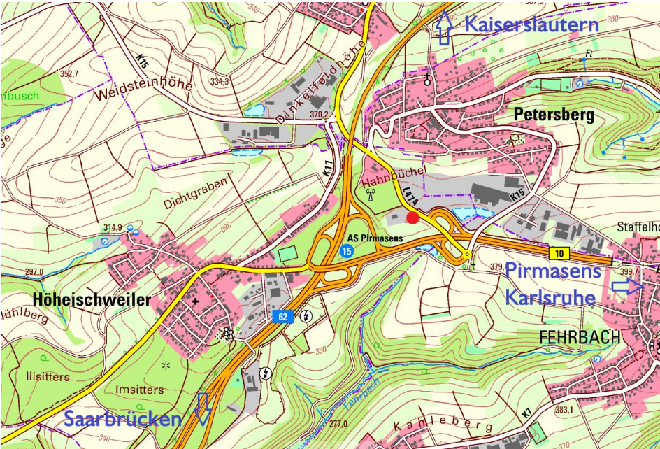 Treffpunkt: Mitfahrerparkplatz an der Anschlussstelle Petersberg der B10 (ETRS-UTM 395483/5454431). Aus Richtung Saarbrücken oder Kaiserslautern auf der B10 in Richtung Pirmasens und gleich wieder abfahren. Anschließend wenige Meter in Richtung Thaleischweiler-Fröschen und links auf den Parkplatz (roter Punkt auf der Karte). Fahrtstrecke ab/bis Treffpunkt etwa 20 km, Gehstrecke max. 4 km.